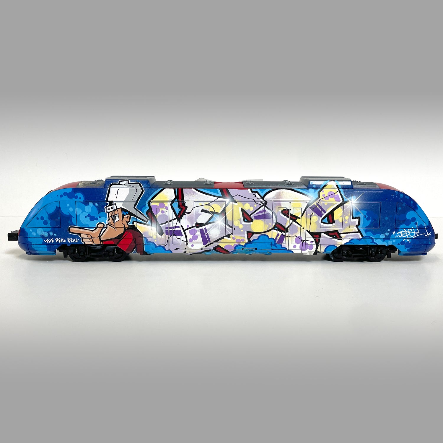 Handbemalter Nahverkehrszug in einer individuell gestalteten Verpackung.