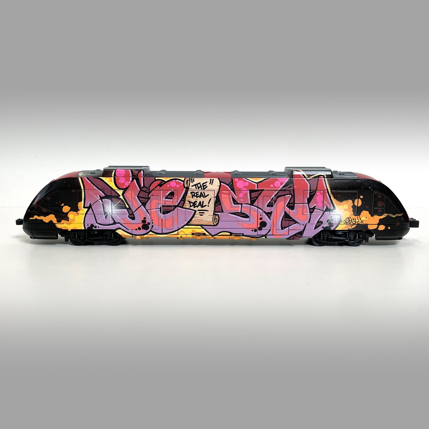 Handbemalter Nahverkehrszug in einer individuell gestalteten Verpackung.